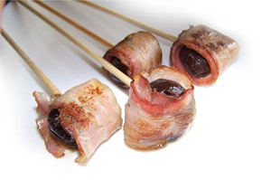 En un recipiente, se remojan las ciruelas durante 2 horas en agua caliente. En una sartén, se saltea la panceta (sin aceite) hasta que se doren un poco, pero sin que lleguen a tostarse. Se retiran y se colocan sobre papel absorbente para eliminar el exceso de grasa. Se enrolla cada ciruela con una tira de panceta . Se ajusta con un palillo dejando la preparación en la punta para comodidad del comensal y una mejor presentación.